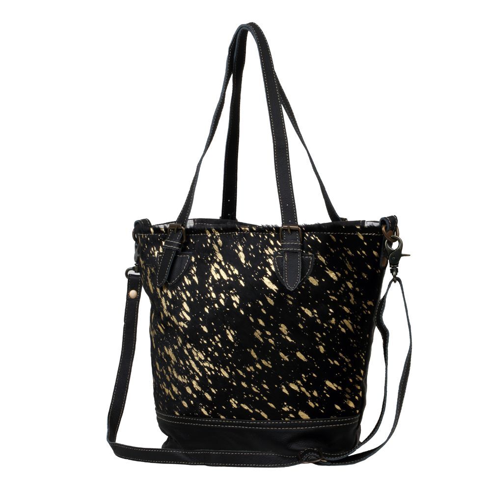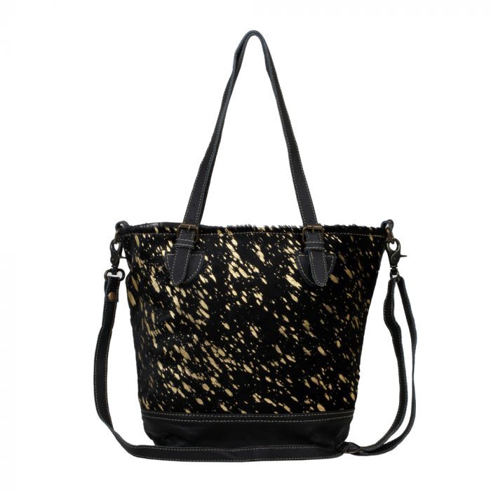Announcing black leather with a gold foil design. A perfectly designed bag to accompany you wherever you go. The inside lining ensures durability.