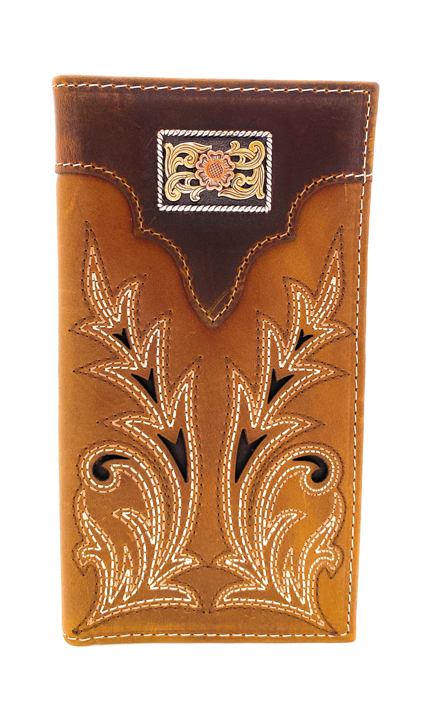 Keep your checkbook, credit cards and cash organized in one place with this Nocona rodeo wallet by M&F Western Products. The wallet has a medium brown boot stitch front with a darker medium brown overlay, along with a 3 tone rectangle floral concho. Inside features multiple compartments for your credit cards, cash, and an ID window.