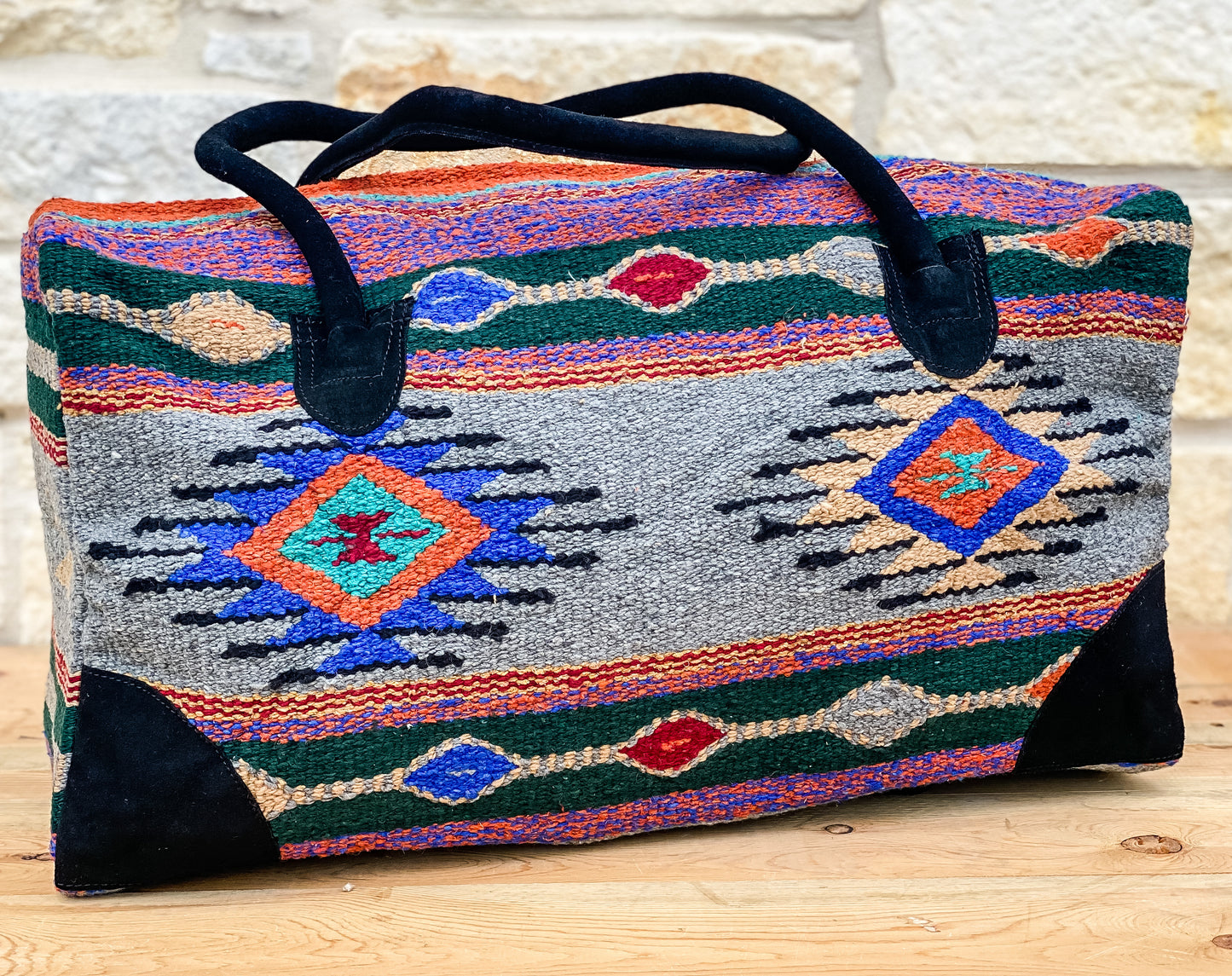 The Go West Duffle Bag is a bold, southwestern-inspired weekender designed for both style and function. Crafted from durable blanket-style fabric featuring a classic Aztec pattern, this spacious travel bag makes a statement wherever you go. The fully lined main compartment offers flexible packing space for clothing, shoes, or essentials, while an interior zippered pocket keeps smaller items organized and within reach. Suede handles and accent corners add structure and contrast, while round plastic feet help protect the bottom of the bag. Whether you're heading out for a weekend trip, rodeo, or everyday travel, this southwest duffle bag blends practicality with timeless western flair.