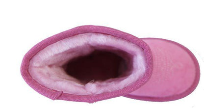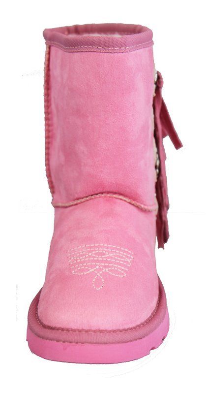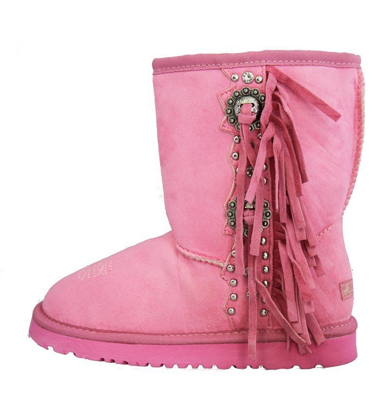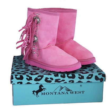 Montana West brand western style kid's cowgirl collection winter snow boots, with decorative floral embroidery over floral applique, silver conchos with tassels on the side decorated with rhinestones. Faux micro suede material, plush faux fur lining, and texture sole. Does not come with box.