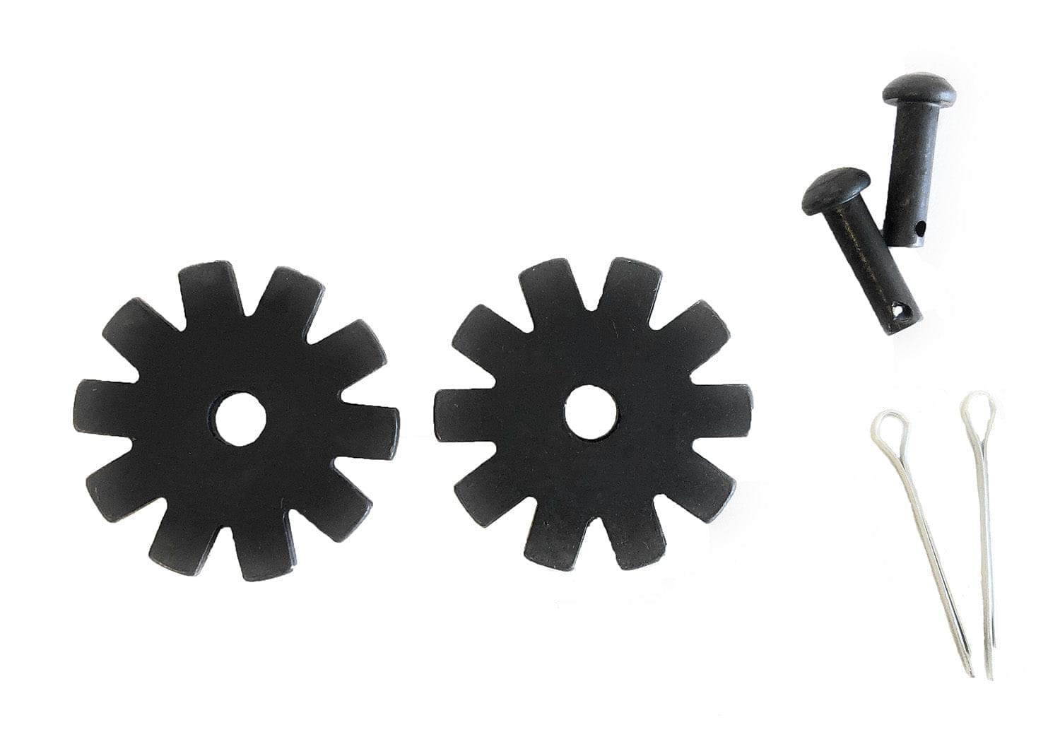 This package include one pair of black steel spur rowels, two spur pins and two cotter pins