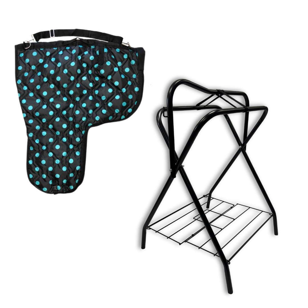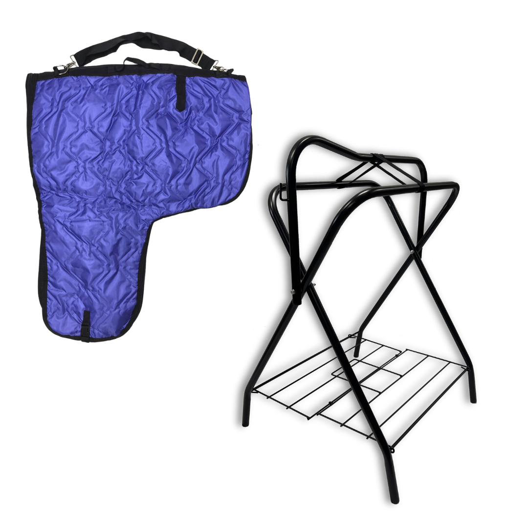 The Freestanding Saddle Rack is crafted from durable powder-coated tubular steel for long-lasting use. It features folding sides for easy transport and storage, and the double straps offer extra stability to securely hold your saddle. The Western Padded Saddle Carrier is made with water-resistant 420 denier poly nylon and poly-fill insulation to protect your saddle from dust and dirt. With a full-length two-way zipper, carrying handle, and adjustable shoulder strap, it makes transporting your saddle effortless and safe.