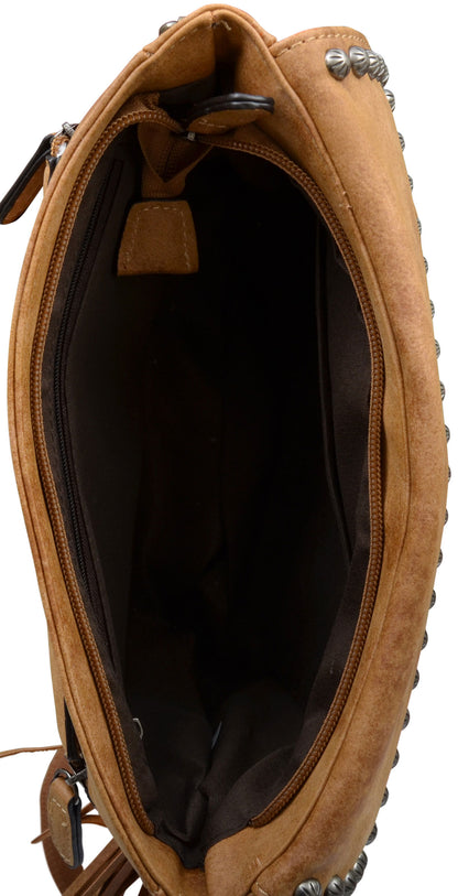 Add a touch of refined western style to your everyday look with the Angel Ranch Conceal & Carry Crossbody Bag by 3-D Belt Company. This crossbody combines elegance and practicality, designed for those who value both fashion and function. Crafted with a vibrant Aztec-textured body and tan leather trim, it’s accentuated with silver nailhead detailing for an eye-catching, artisanal feel. This sophisticated piece offers a streamlined way to stay organized, with thoughtfully placed pockets and compartments, including a discreet, lined concealed carry pocket, all within a chic, compact design. Perfect for the modern woman who appreciates a blend of style, security, and quality craftsmanship.