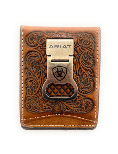Ariat Men's Leather Bifold Money Clip - Tan Baksetweave and Floral Embossed With Bottle Opener