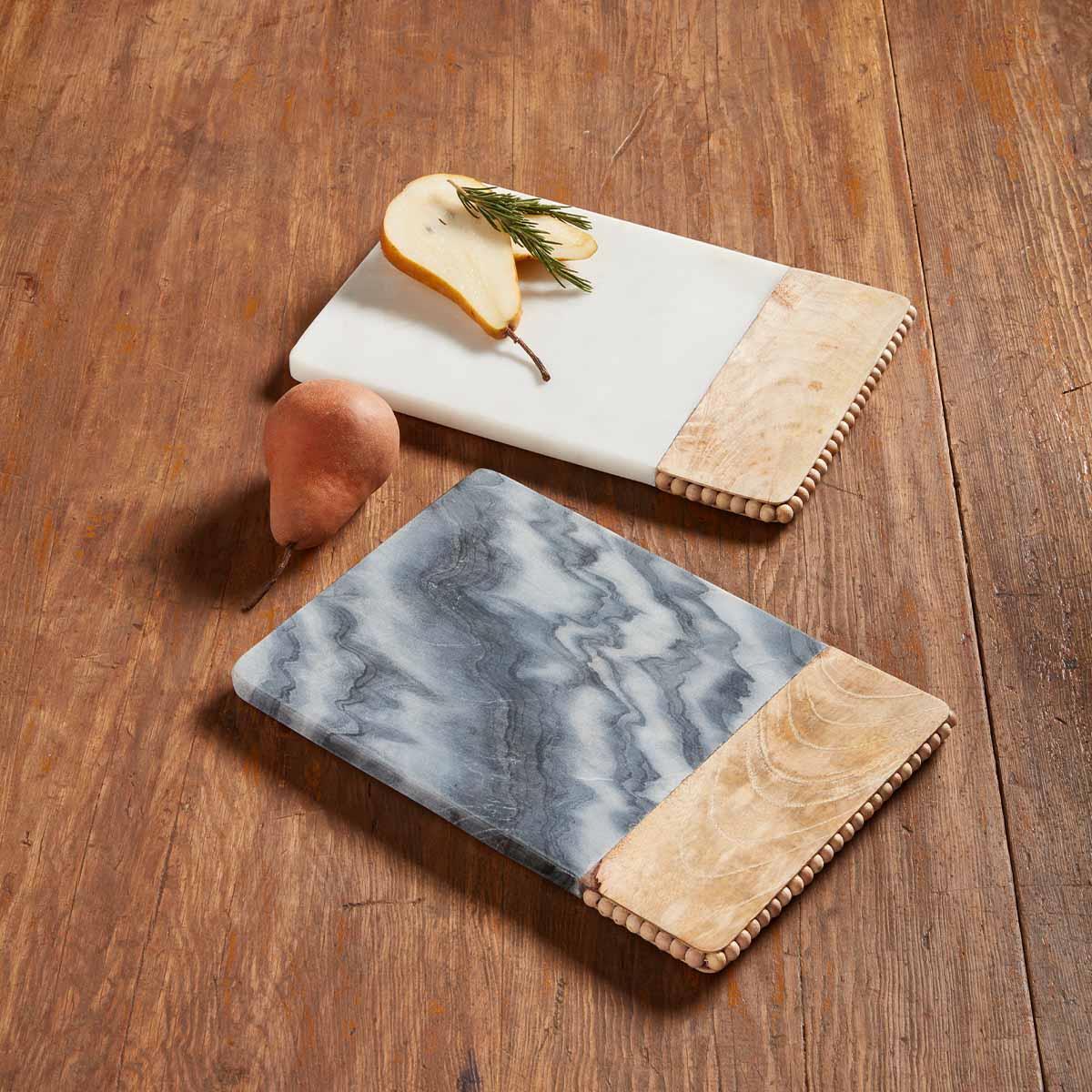 The combination of wood and marble make this serving board a classic addition to any kitchen! Add a touch of natural wood to your serving platter with the Mud Pie gray beaded wood and marble board. The board features a unique combination of marble with a rustic touch of mango wood. The wood section also features beaded details on the rim. These are perfect for creating a simple cheese board!