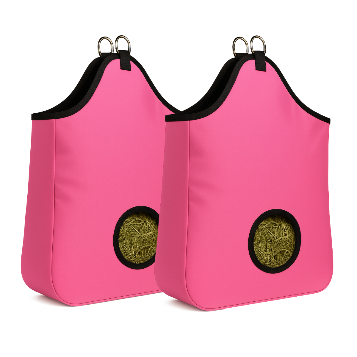 Built for durability, convenience, and cleaner feeding, the AJ Tack Hay Bag - 2 Pack is crafted from rugged 600D poly PVC-coated nylon that stands up to daily barn life, trailering, and travel. Designed to help reduce waste and keep hay contained, this bag features two reinforced metal rings at the top for quick hanging in stalls or trailers, plus a back ring that stabilizes the bag and prevents swinging. The 7" front opening offers comfortable, controlled access to hay while minimizing mess, making it an excellent choice for horses who need steady forage at home or on the go. Available in a variety of colors, this hay bag delivers both practicality and style for any barn setup.