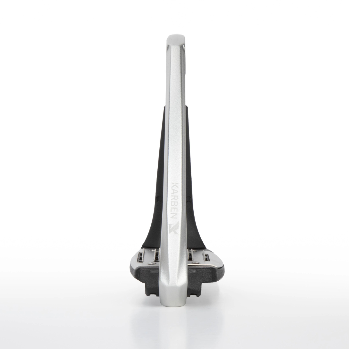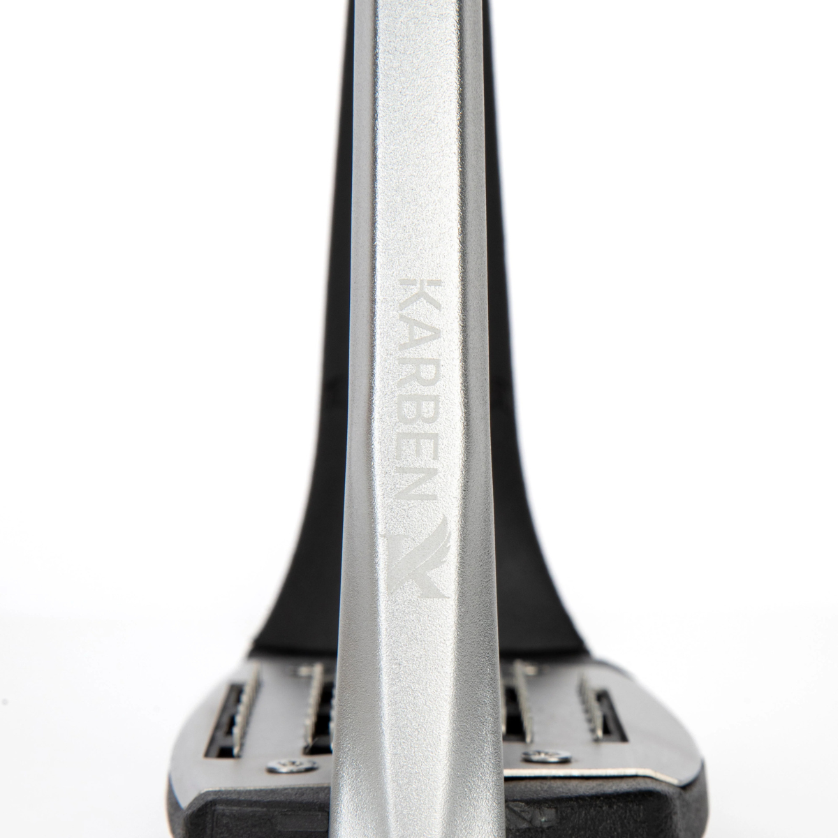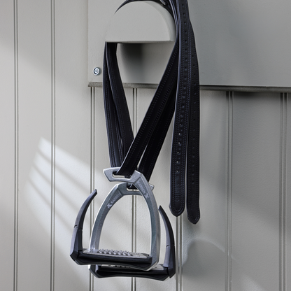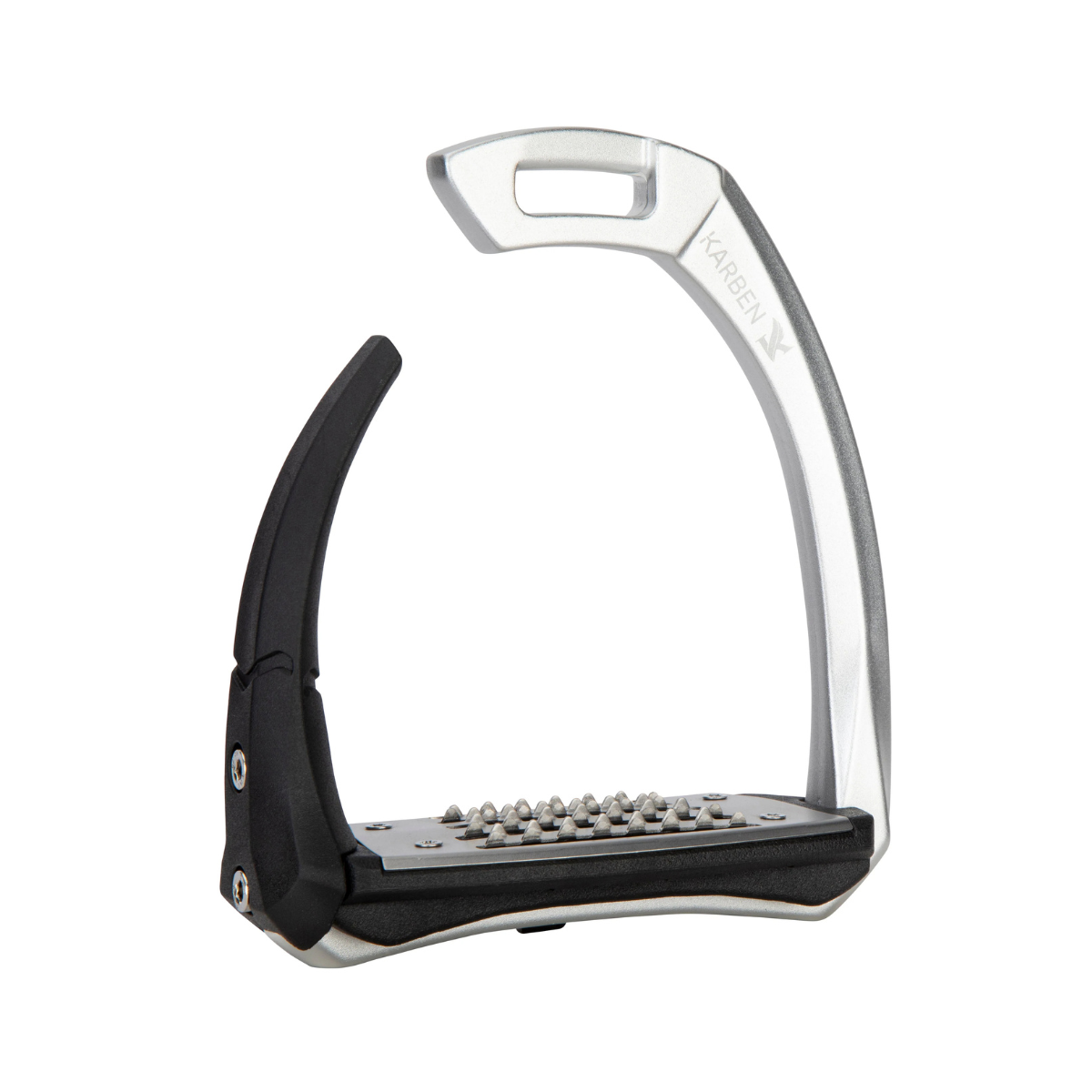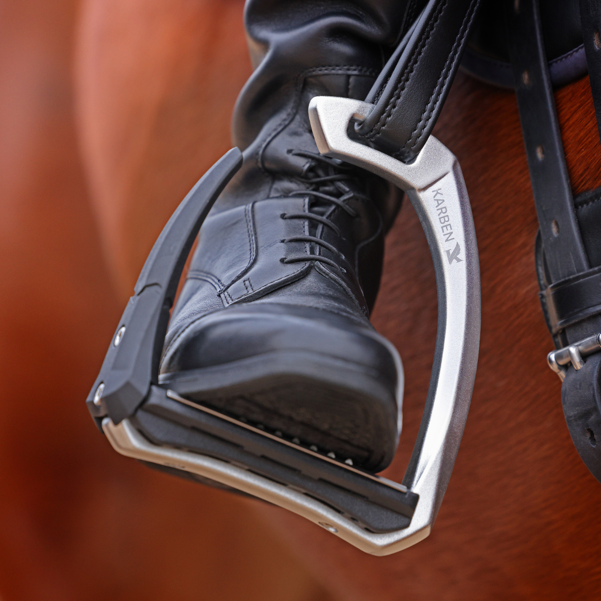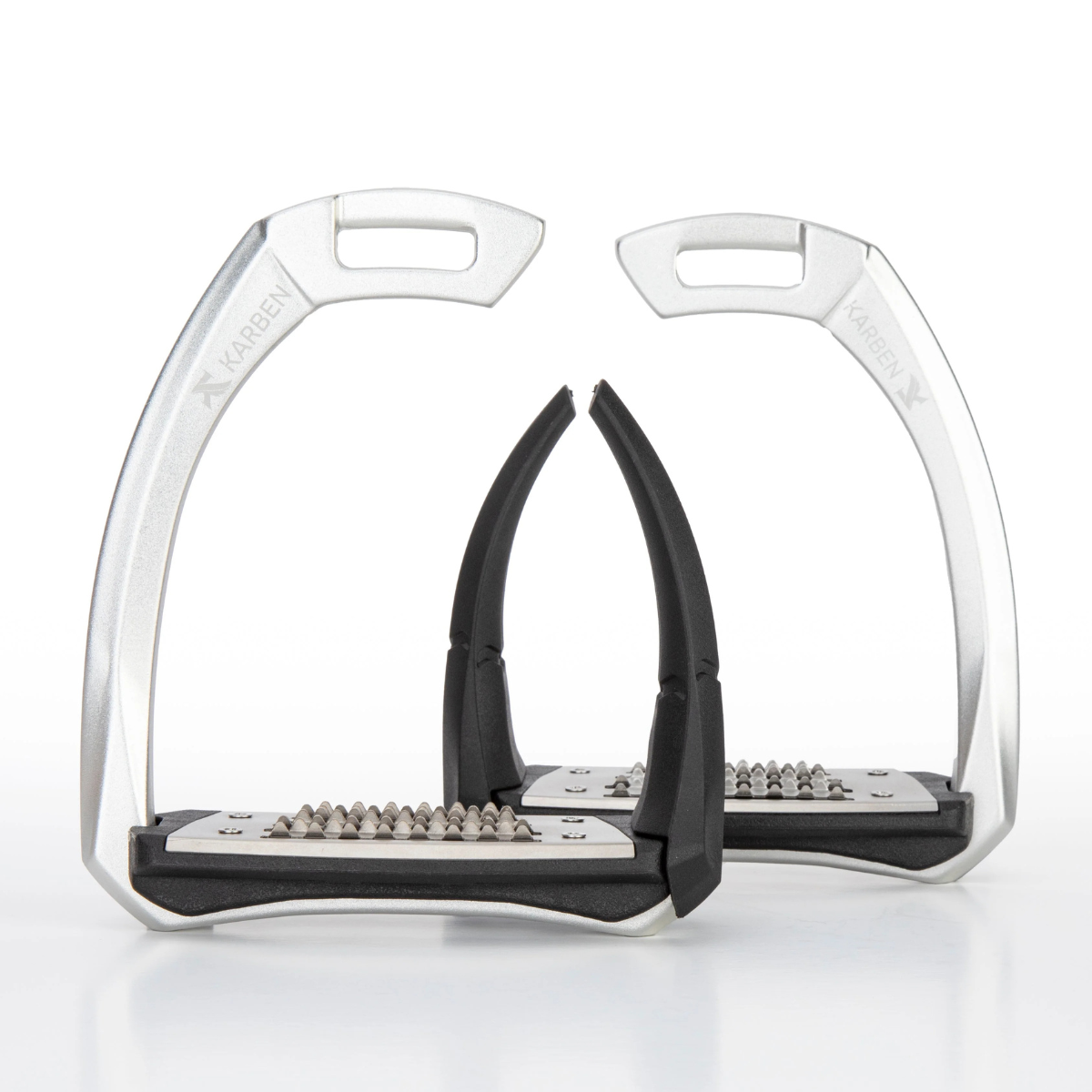 Engineered for performance and rider safety, the Karben Ultra Grip FX Stirrups combine sleek design with smart function. Crafted from ultra-light aluminum and finished with a low-maintenance powder coating, these stirrups are as durable as they are eye-catching. The outer safety arm is designed to flex under pressure during a fall, allowing the foot to release and reducing the risk of serious injury. After release, the rubber arm returns to its original supportive shape. A weighted, shock-absorbing base adds balance and comfort, while deep treads offer reliable grip in all conditions—perfect for high-intensity riding. An angled eyelet promotes natural alignment and easier stirrup retrieval, making these a standout choice for both training and competition.