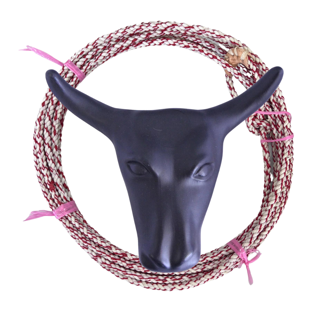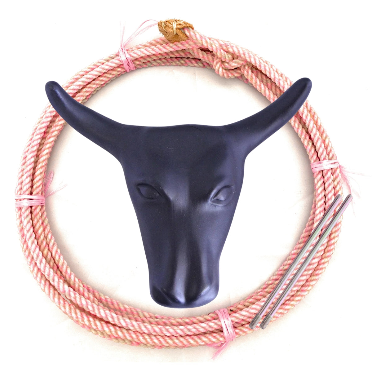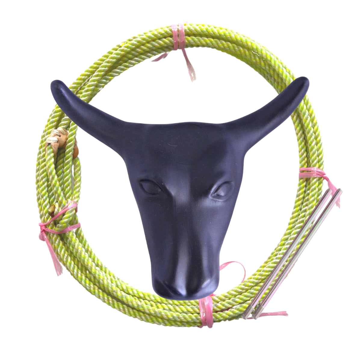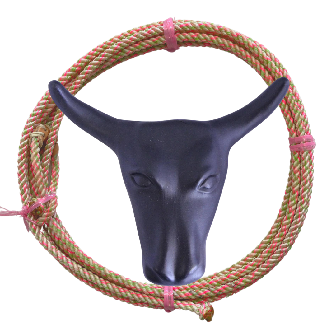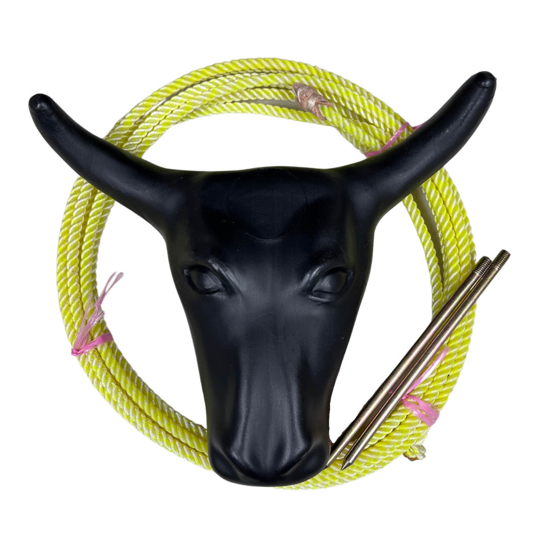 Introduce young ropers to the fundamentals of roping with the AJ Tack Junior Steer Head Dummy Set, a complete practice setup designed for durability, ease of use, and skill development. The junior-size steer head is made from heavy-duty polyethylene to withstand repeated practice sessions and outdoor use. It easily mounts to a standard hay bale using the included 7" steel rods, creating a stable and realistic practice target. The set also includes a 20-foot twisted poly-nylon kid’s lasso, lightly hand-waxed for improved grip and smoother handling. Finished with a hand-sewn leather burner for added authenticity and control, this set is ideal for helping young ropers build confidence, coordination, and proper technique.