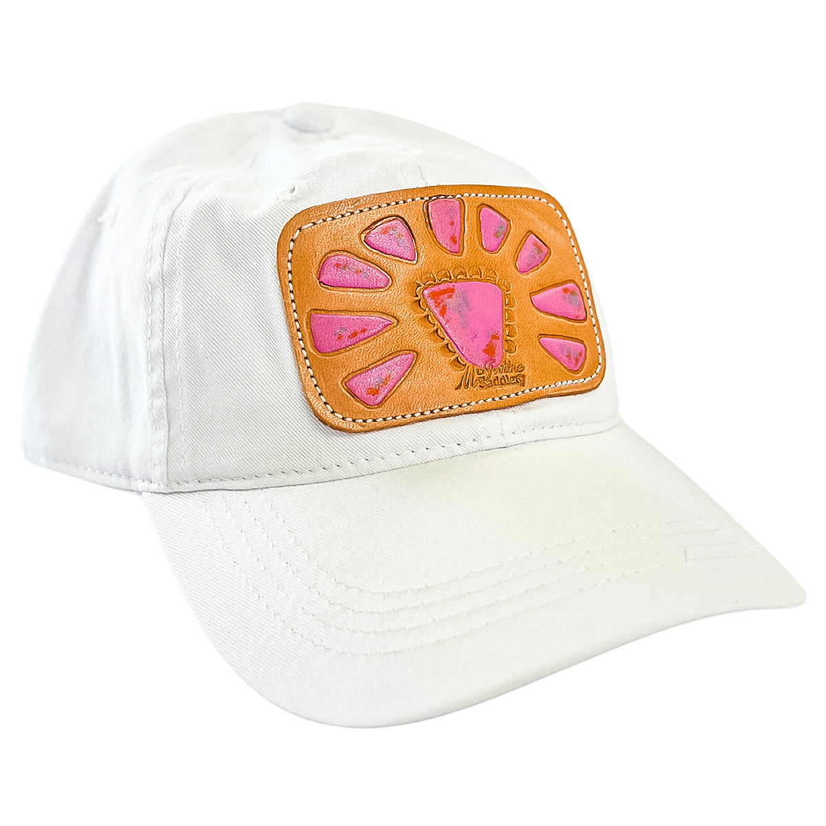 This cap by McIntire Saddlery puts a western flair on a classic white cap. The pink squash blossom leather tooled patch brings a fun touch of western charm to any outfit.