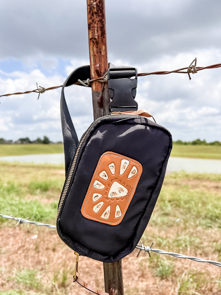 Experience the perfect blend of tradition and style with the McIntire Saddlery Belt Bag. Each bag features a hand-tooled and painted leather patch, ensuring a unique piece that reflects the rich heritage of Western craftsmanship. The adjustable strap with a secure buckle allows you to wear it in various ways, while the zippered closure on the back keeps your essentials safe and accessible. Inside, mesh pockets provide organization and visibility for your belongings. Infused with Western flair, these belt bags add a touch of rustic elegance to any outfit.