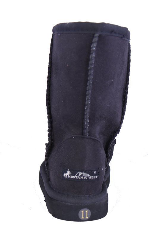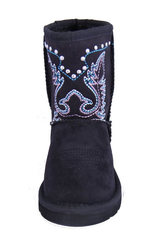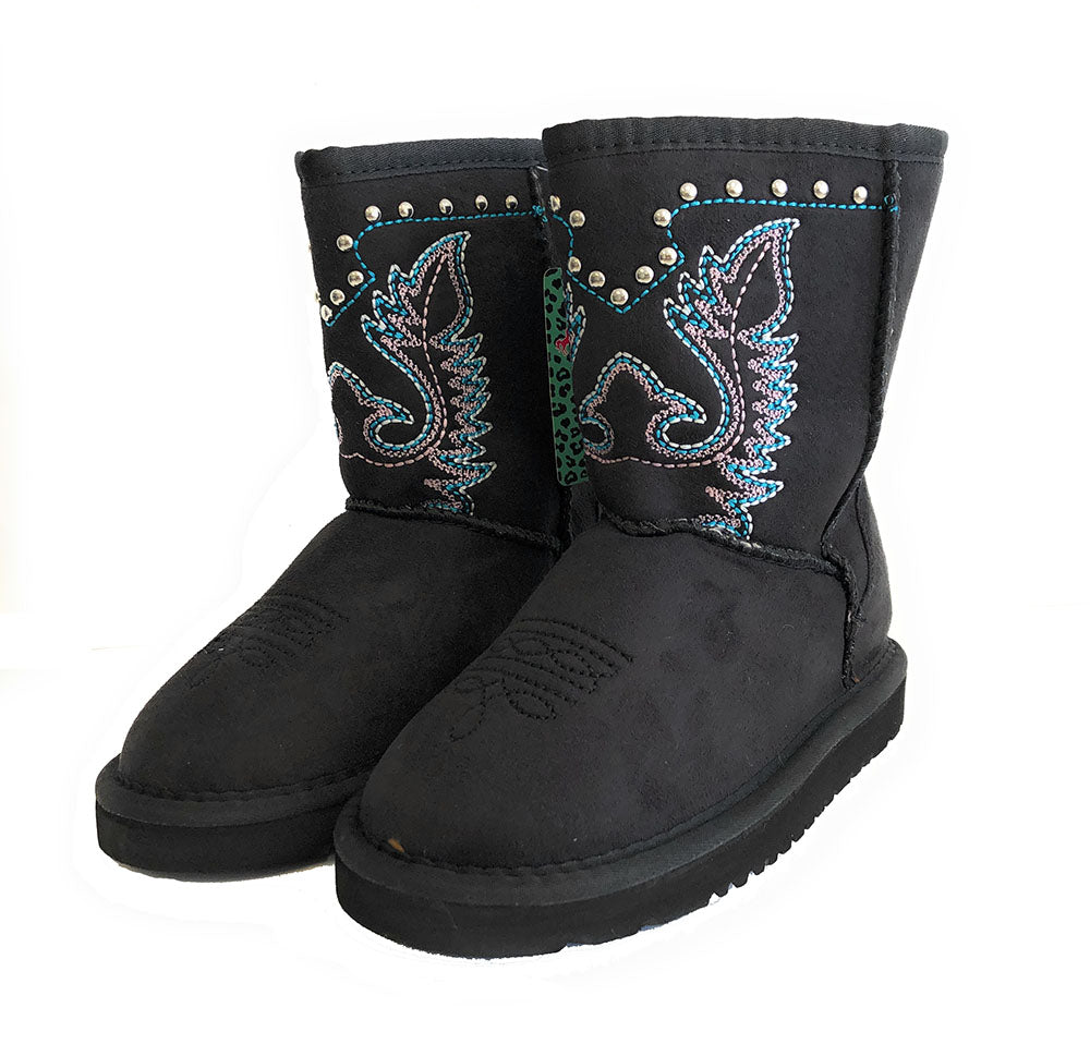 Montana West brand western style kid's cowgirl collection winter snow boots, with decorative floral embroidery over floral applique, embellished with silver studs. Faux micro suede material, plush faux fur lining, and texture sole. Does not come with box.