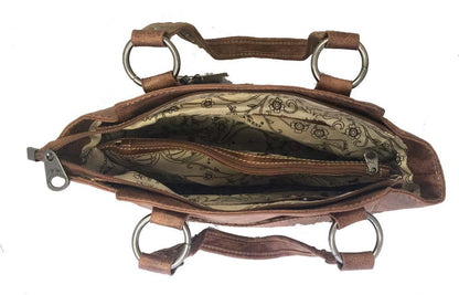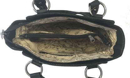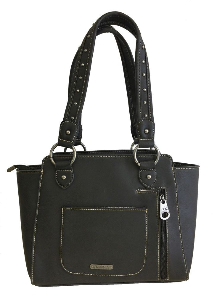 Montana West brand western style ladies concealed handgun collection purse, made with high quality PU leather. The purse is decorated with a combination of cutouts with contrasting color beneath, whip stitching, and studs that form a swirling floral and daisies pattern. Features:
