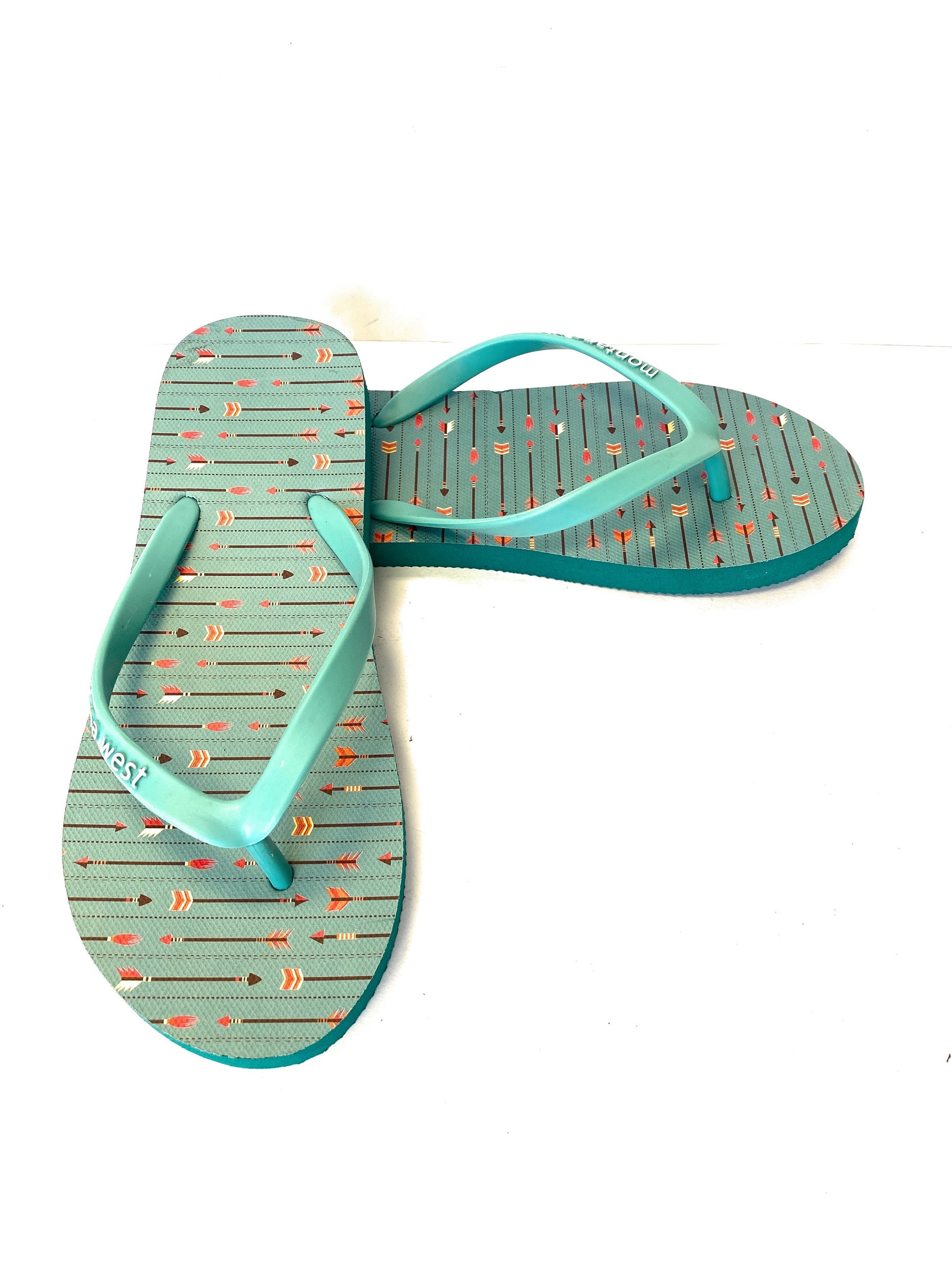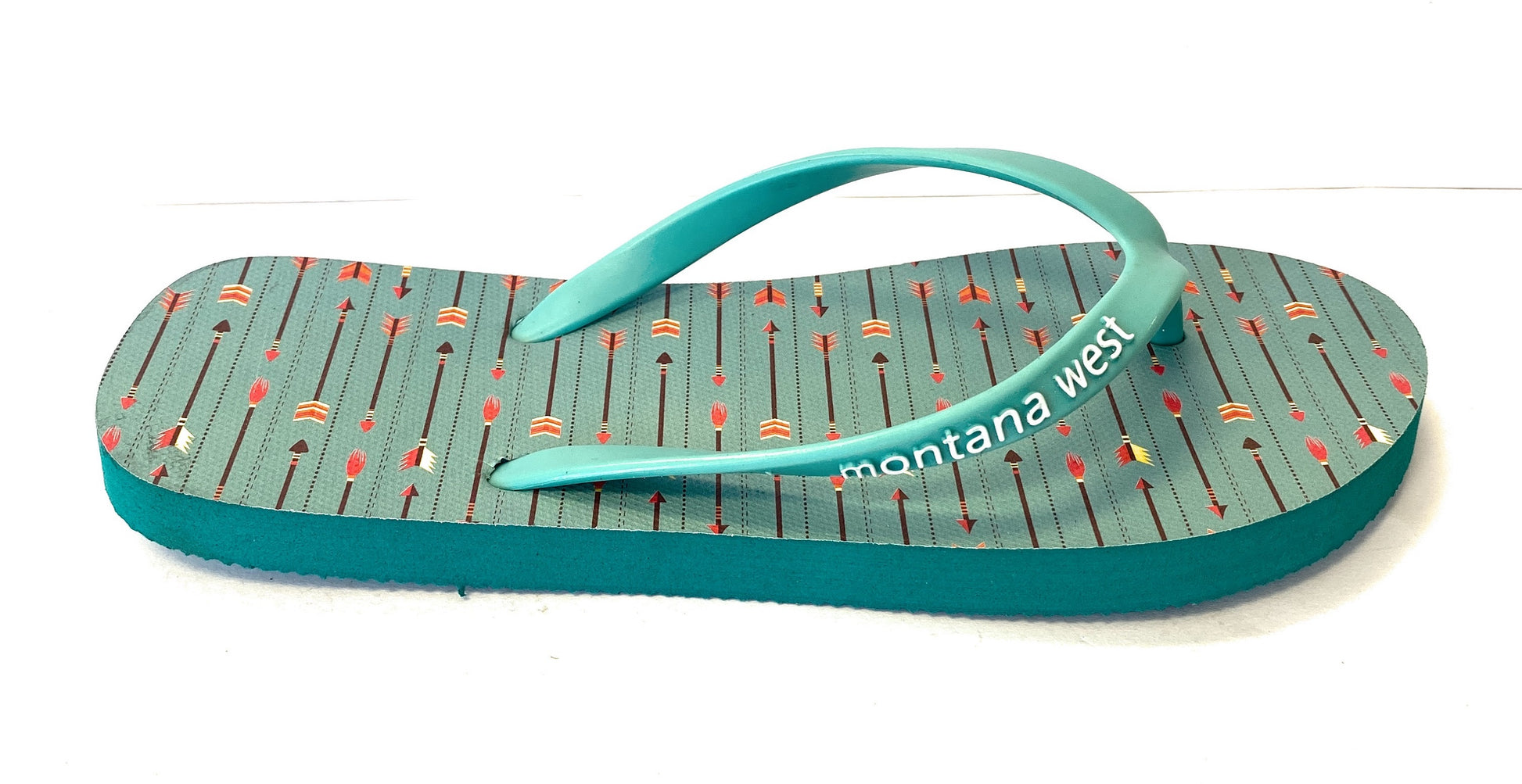 Montana West brand Western Arrow Collection western women's flip flops. Turquoise western arrow print, easy slip-on style, thin 1⁄2" sole. Great for all summer activities. Available in Small (6-7), Medium (8-9), Large (10), and Extra Large (11).
