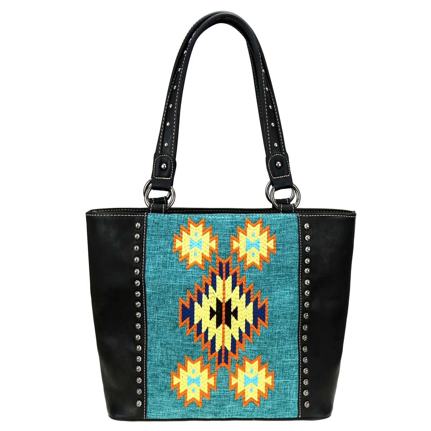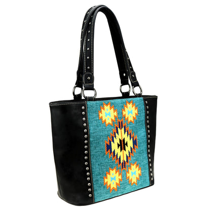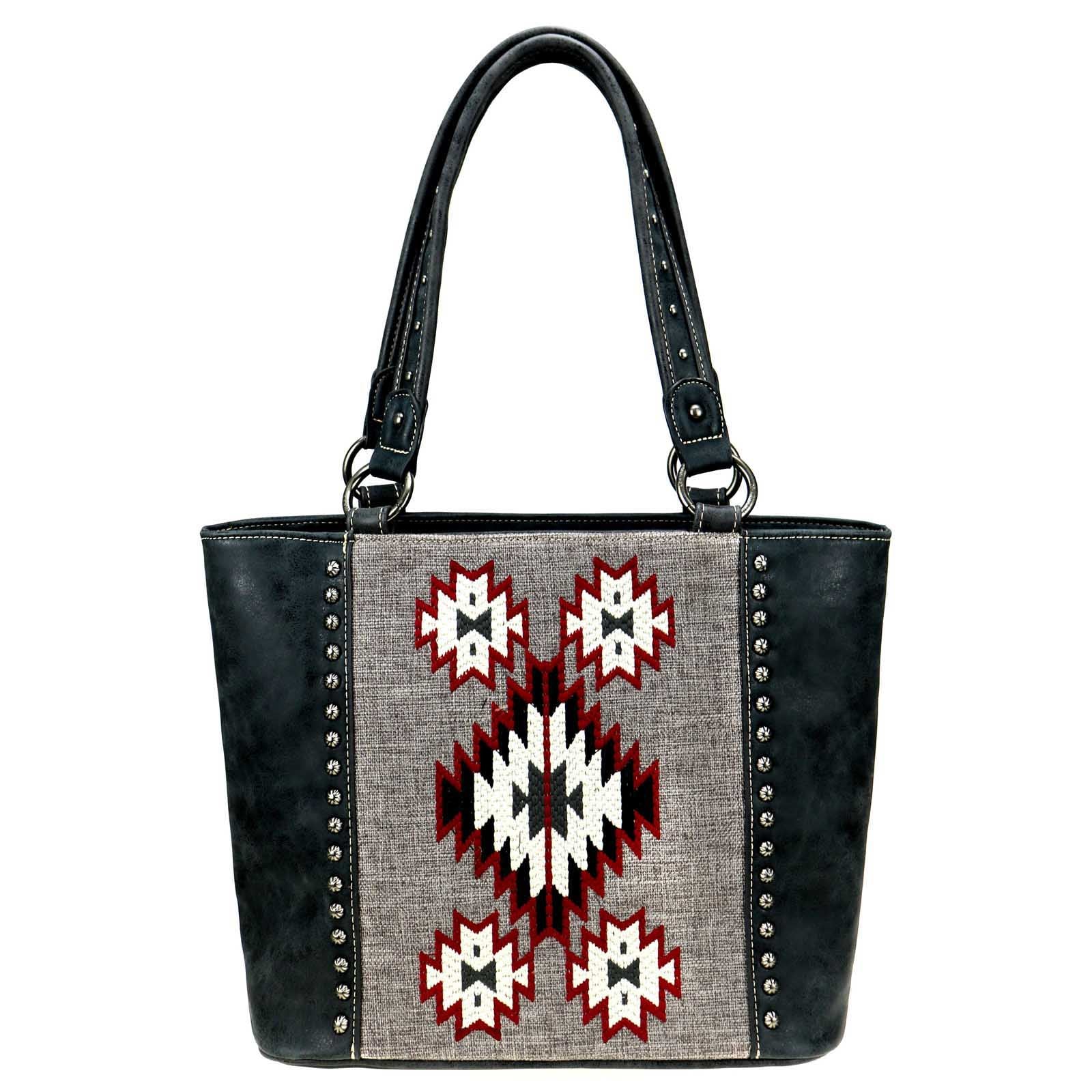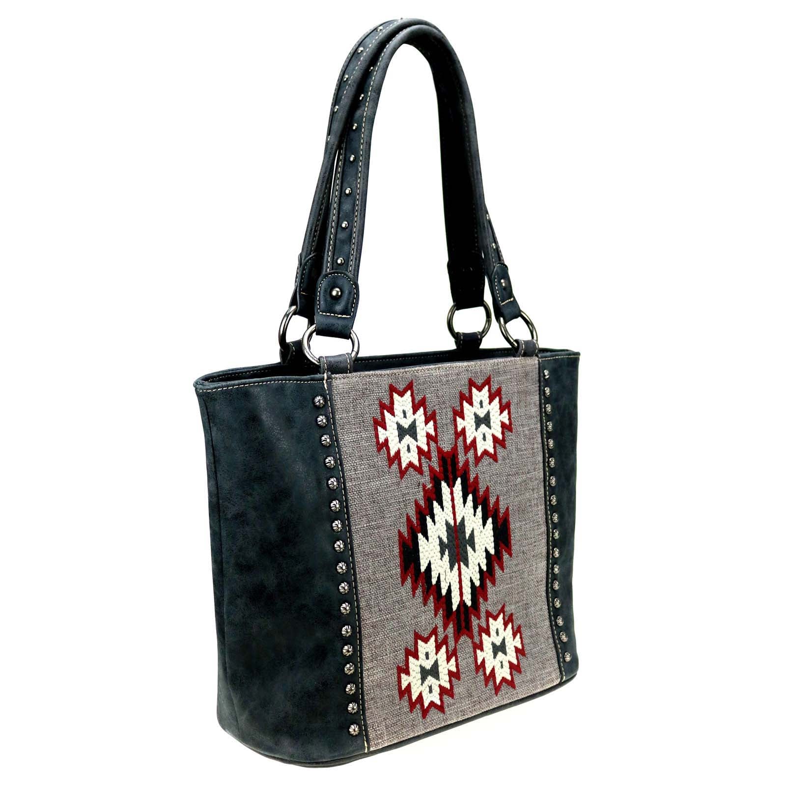 Montana West Aztec Collection womens tote style purse with concealed handgun pocket. Made with PU leather, aztec embroidered over canvas on front, decorated with antique silver studs. Features:
