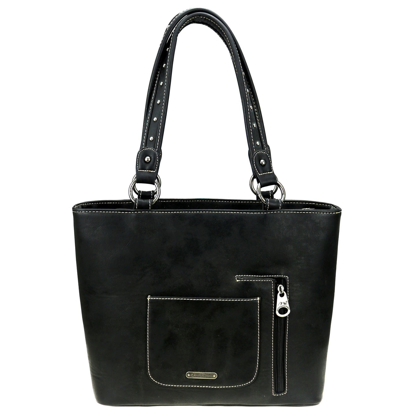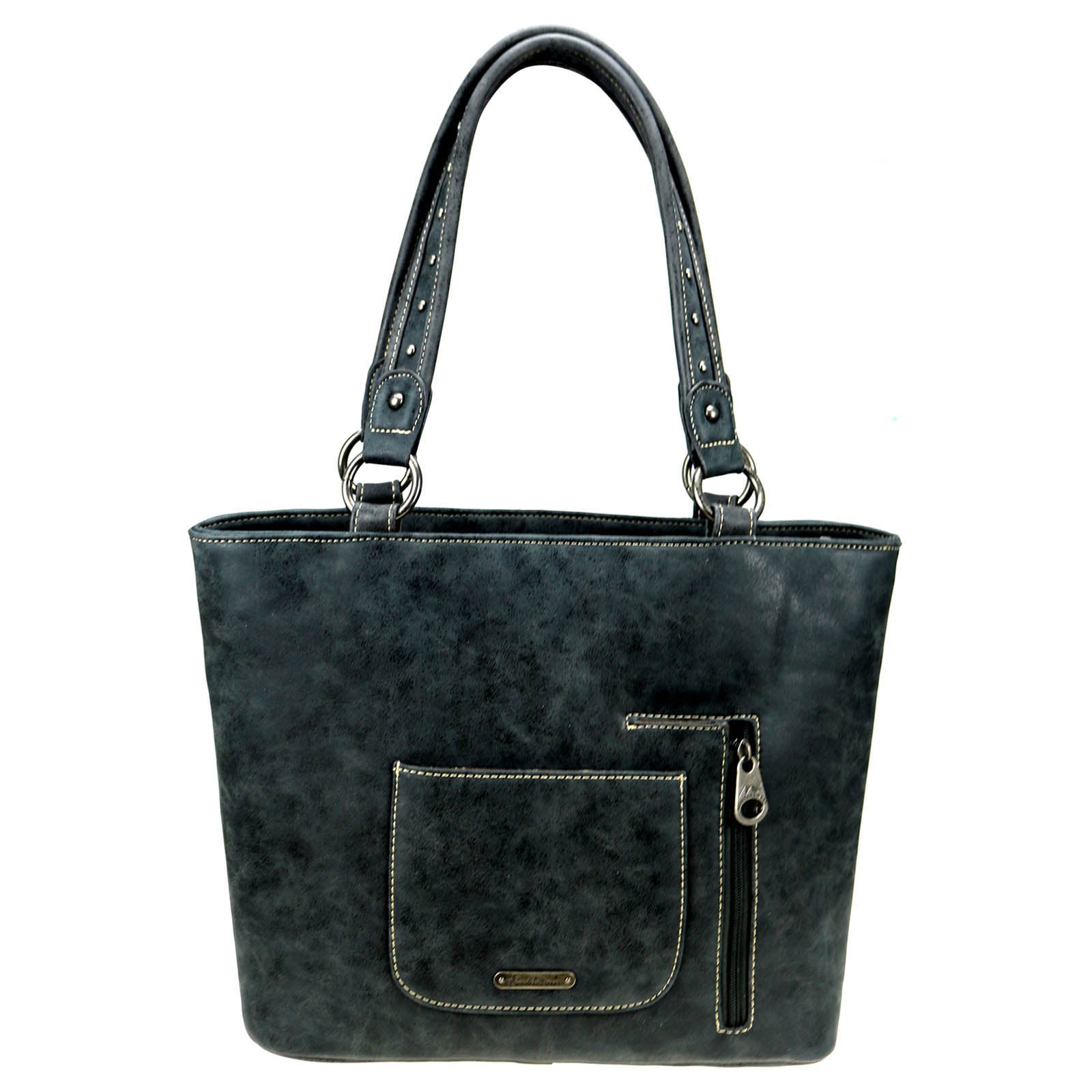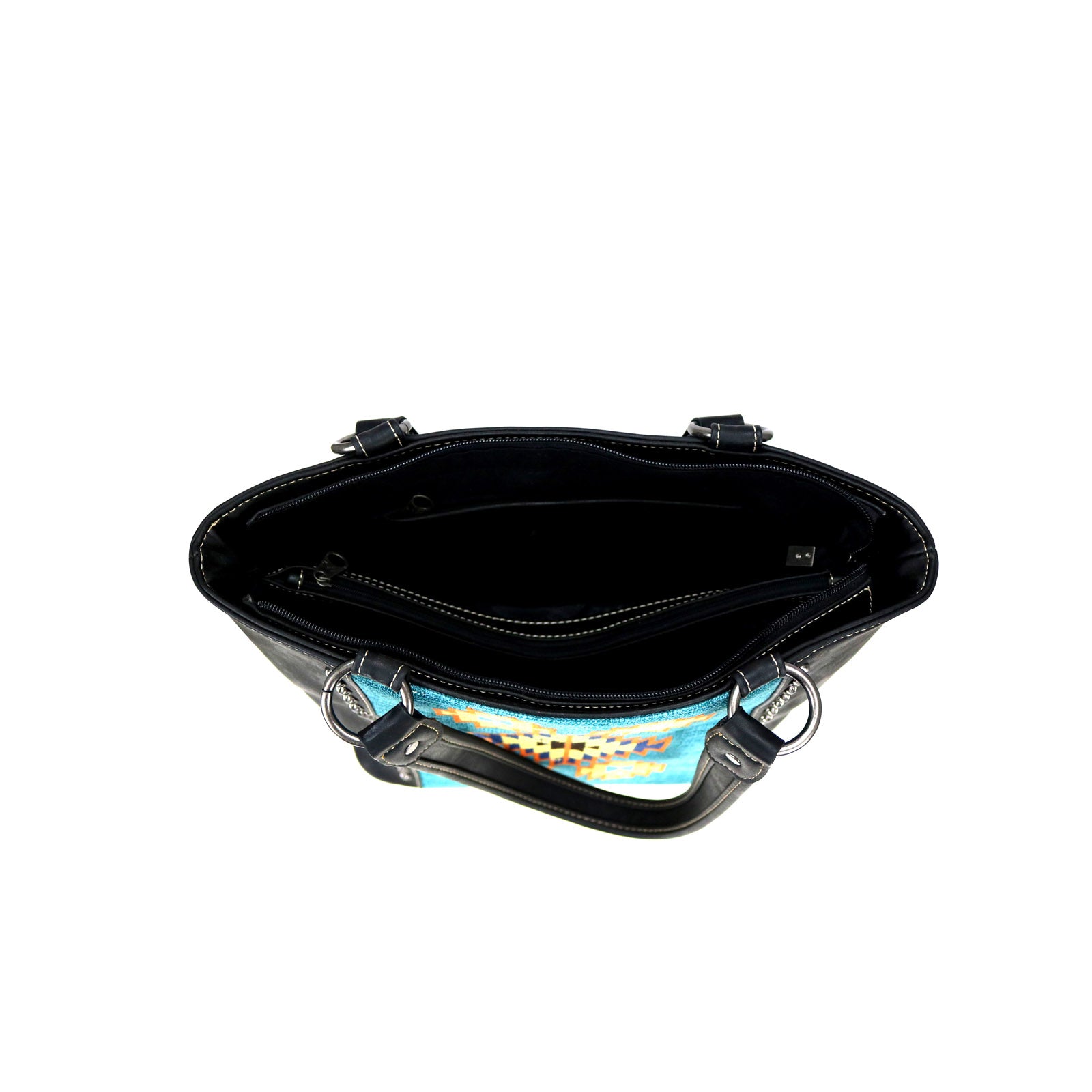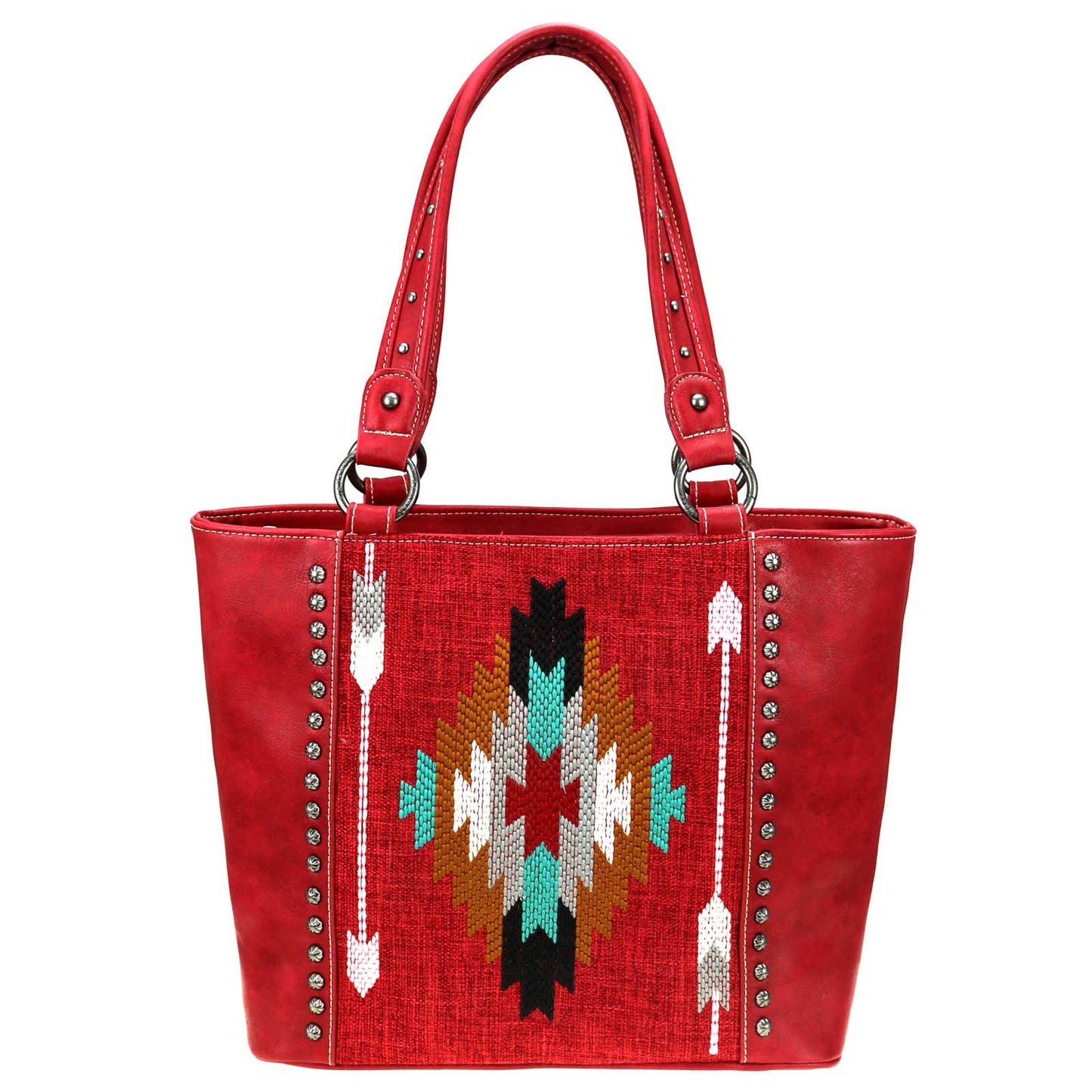 Montana West Aztec Collection womens tote style purse with concealed handgun pocket. Made with PU leather, aztec embroidered over canvas on front, decorated with antique silver studs. Features:
