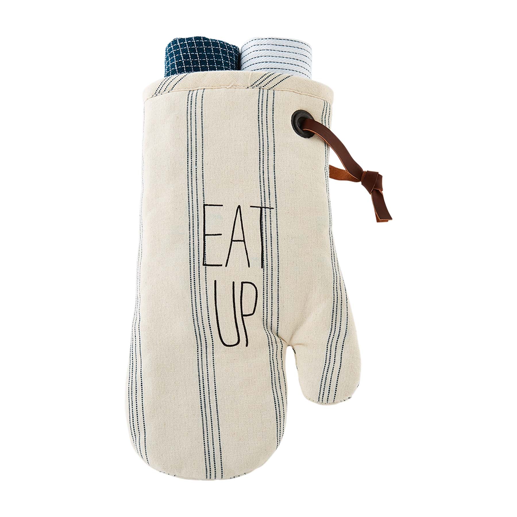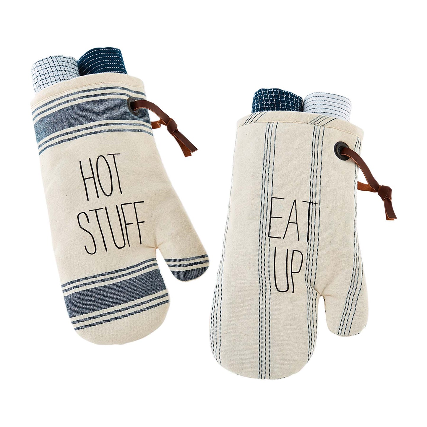 Give these "Eat Up" and "Hot Stuff" Oven Mitts and Dish Towel Sets as a house warming gift! The three piece set comes with a printed grain sack oven mitt. The oven mitt features a corner grommet and leather loop. The oven mitt arrives with two cotton dish towels.