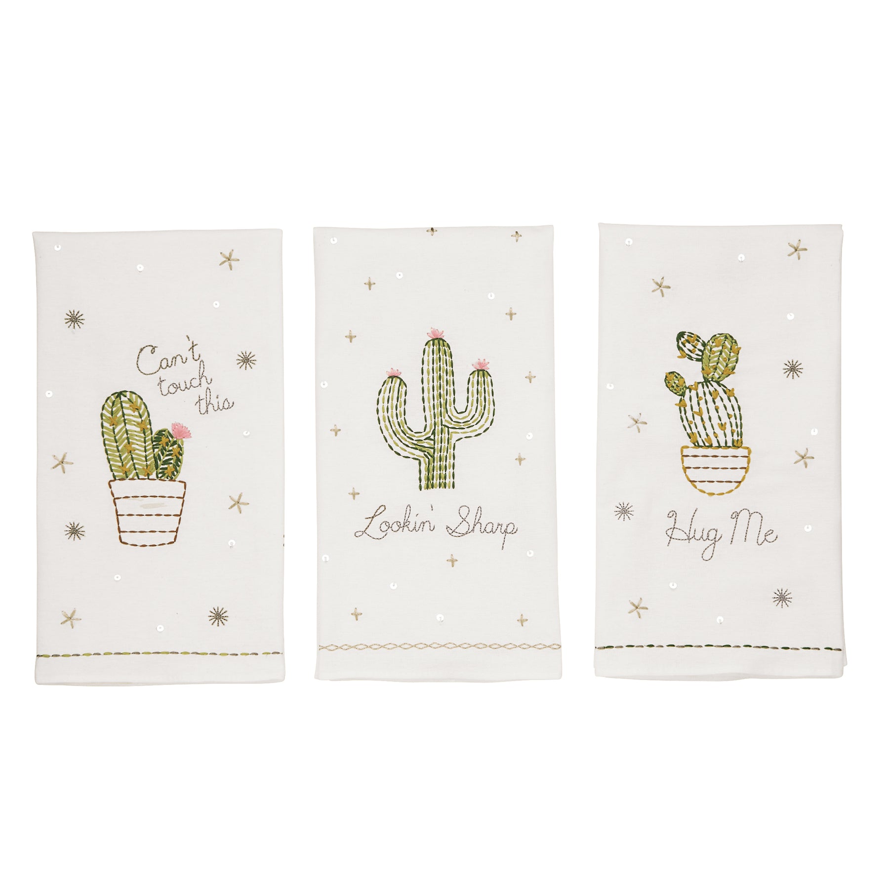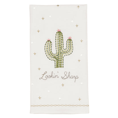 With cheeky sayings of "Can't touch this", "Lookin' Sharp", and "Hug Me", these embroidered cactus towels will brighten up any space!