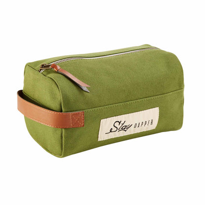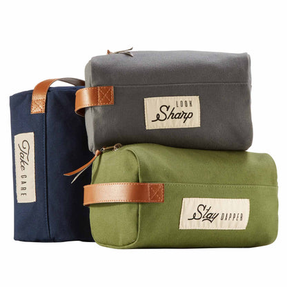 Canvas dopp kit featues twill sentiment patch and genuine lether handle and zipper pull. Great gift for any man!