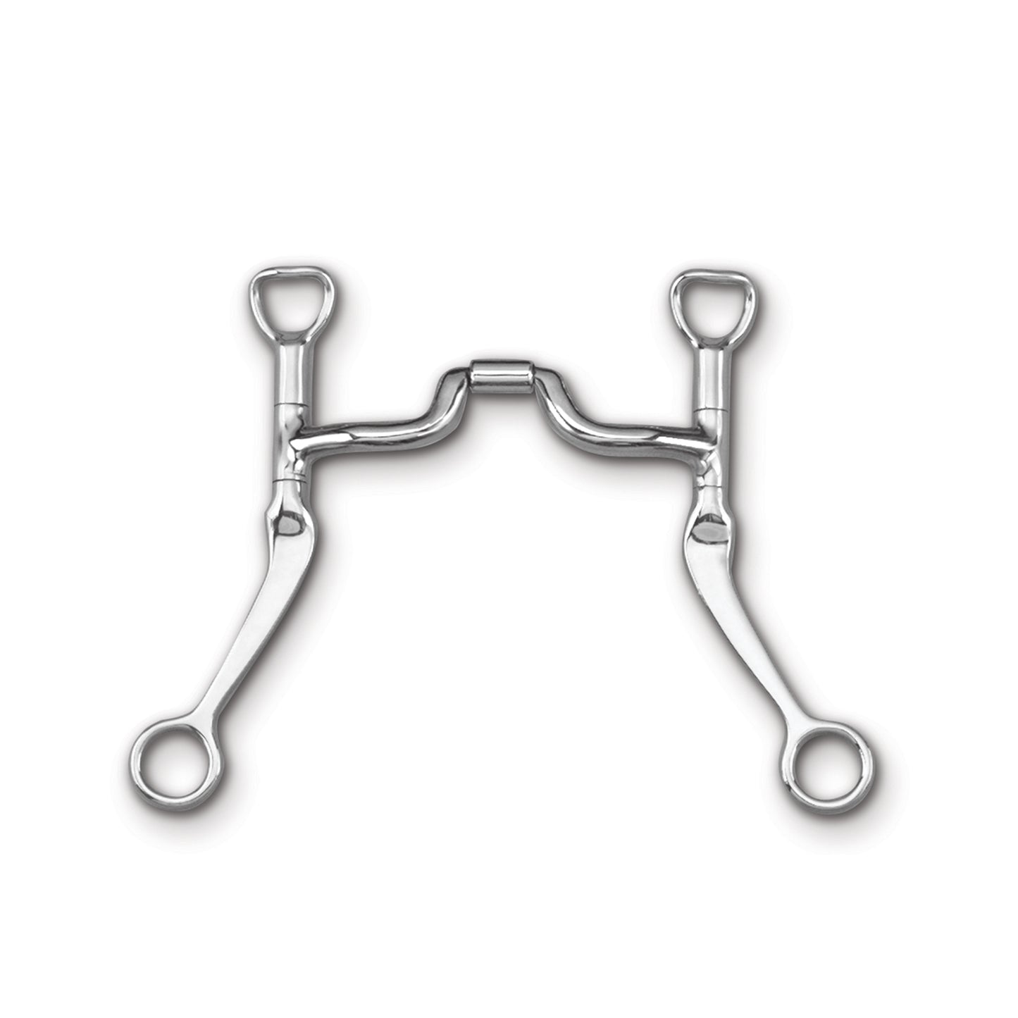 The 7" Flat Shank is stainless steel and curved slightly back towards the horse, with a flat-top purchase and a rein ring. The mouthpiece has a fixed attachment. The Flat Shank has the patented Independent Swivel Cheek, where the purchase, mouthpiece and shank all move independently of each other. The purchase is slightly angled away from the cheek to avoid rubbing. It has an indirect (curb) rein action designed to be used with a curb strap which attaches to the purchase. The flat shank uses the combination of the fixed cheek and fixed rein to apply pressure to the mouth, chin and poll.