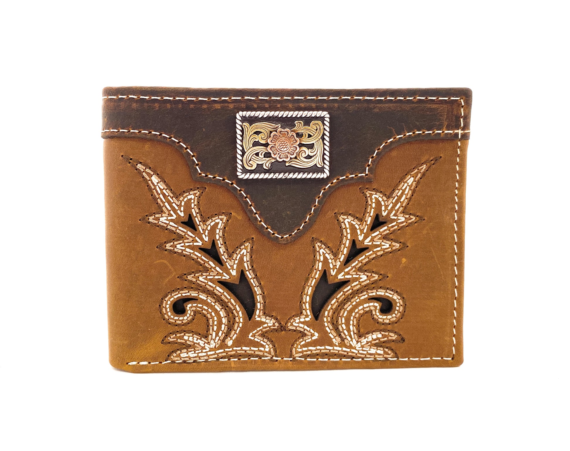 Keep your credit cards and cash organized in one place with this Nocona bifold wallet by M&F Western Products. The wallet is made of genuine leather and has a medium brown boot stitch front with a darker medium brown overlay, as well as a 3 tone rectangle floral concho. It features multiple compartments for your credit cards, cash, and an ID window.