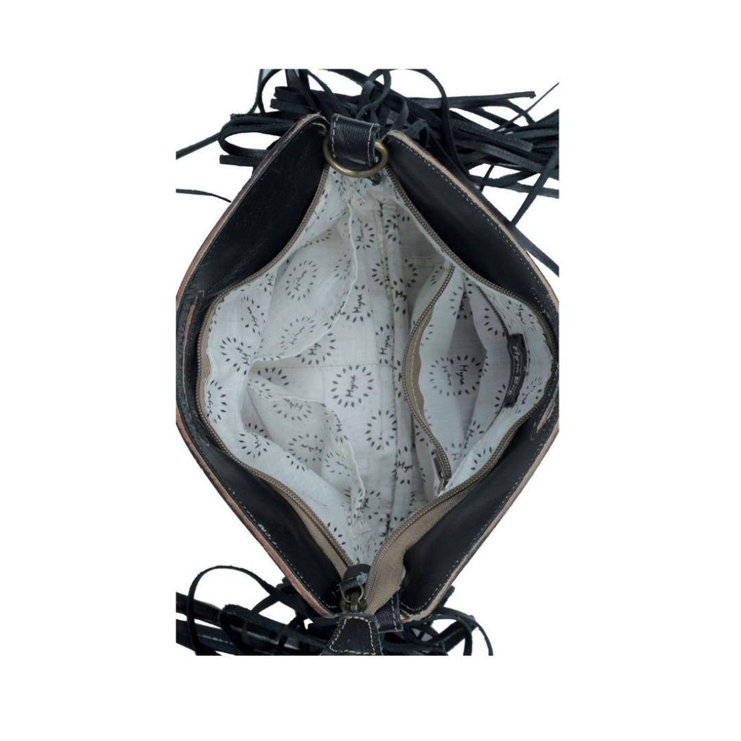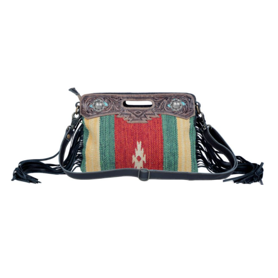 Aztec rug, tooled leather, and fringe? What more could you ask for! Throw this bag on as a crossbody or shoulder bag and be prepared for all eyes to be on you! Upcycled with aztec rug and turquoise accents, this bag adds to perfect pop of color to any outfit!