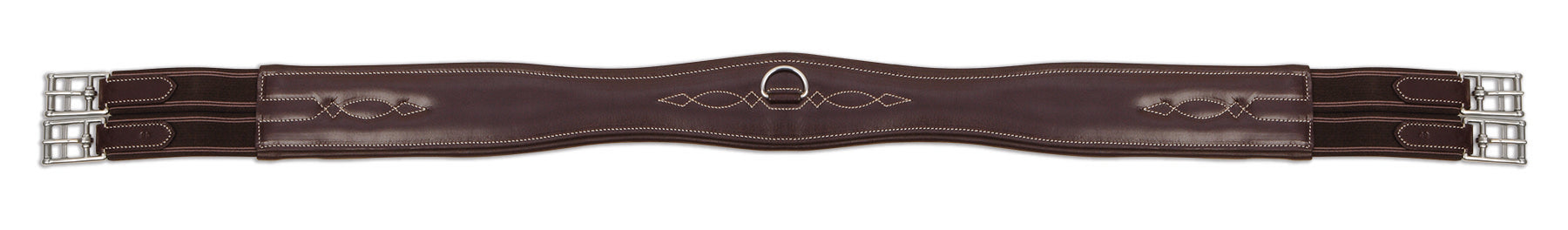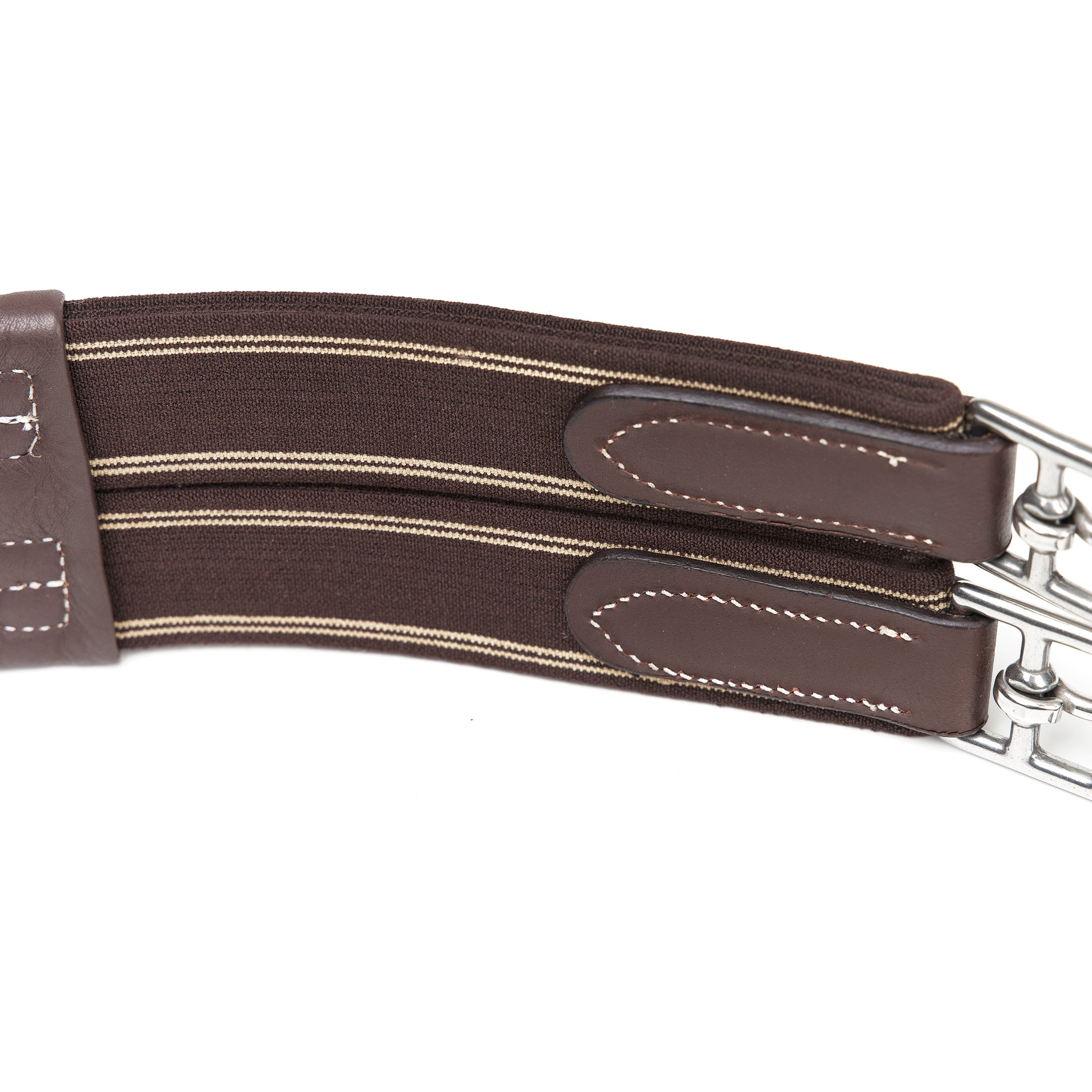 The Shires Velociti Lusso Atherstone Leather Girth is crafted for both comfort and performance, offering a high level of cushioned support to evenly distribute pressure and reduce the risk of chafing. Its contoured shape allows for freedom of movement around the elbows, while soft, rounded edges help prevent pinching. Finished in a deep, rich Dark Havana brown, this premium girth features elegant white stitching, strong elastic at both ends, and durable stainless steel fittings for lasting quality.