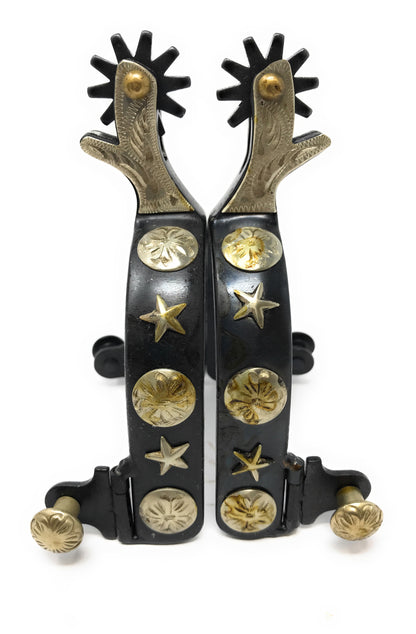 The AJ Tack Men's Antique Brown Stars and Flowers Spurs are crafted for the western showman who values timeless design and practicality. These black steel spurs feature hand-engraved silver floral conchos and star overlays, adding a touch of sophistication to their rugged build.