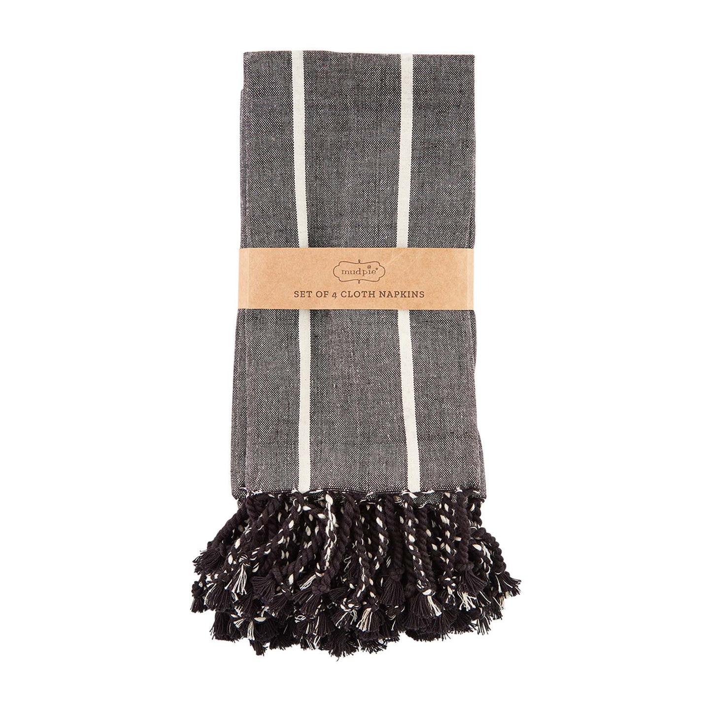 Raise your serving game with these Turkish cotton, dinner napkin set. The set comes with four woven Turkish cotton dinner napkins available in black, gray, and white. These dinner napkins feature a tassel trim. Each set of 4 is sold seperately.